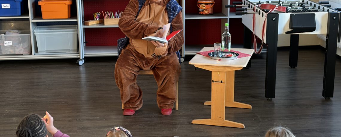 Heute ging es tierisch zu an der Regenbogenschule Bawinkel: Balu, der Bär kam als Überraschungsgast vorbei. Mit voller Kostümierung las …